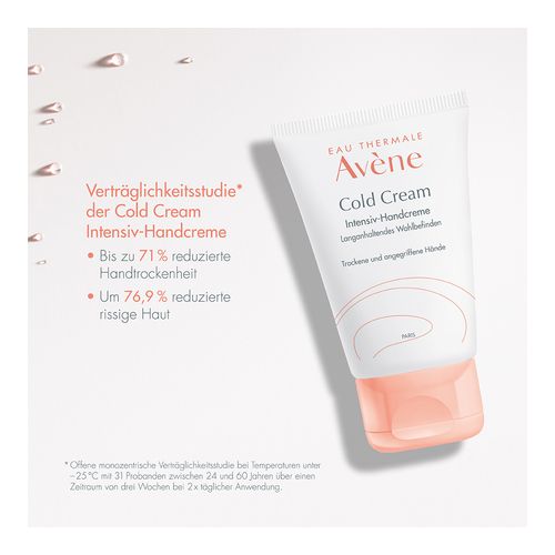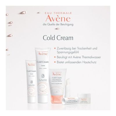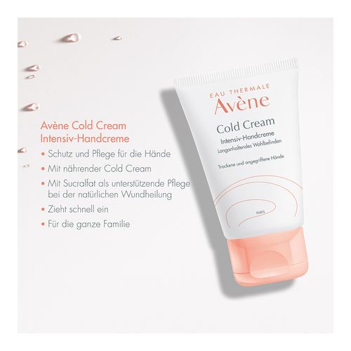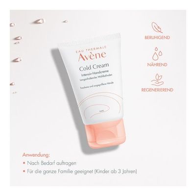 Hautcreme für empfindliche, trockene, trockene bis sehr trockene, rissige, gespannte oder durch äußere Einflüsse (Wind, Kälte usw.) geschädigte Hände. Sie gleicht die Austrocknungseffekte aus, die durch die Verwendung von hydroalkoholischem Gel und übermäßigem Händewaschen entstehen. Dieses nährende Pflegeprodukt mit seiner umhüllenden Textur und dem leichten Duft beugt Rissen, Rauheit, Frostbeulen und trockener Haut vor. Sie schützt und befeuchtet die Haut und hinterlässt weiche, nicht fettende und nicht klebende Hände. Die neue sensorische Formulierung mit 99 % Aktivstoffen natürlichen Ursprungs spendet 24 Stunden lang intensiv Feuchtigkeit, nährt und schützt gereizte, rissige und spröde Hände. Dank des Aktivstoffs Cold Cream, der von Galen – dem berühmten griechischen Arzt der Antike – entwickelt wurde und dessen traditionelle Formulierung von den Avène Dermatological Laboratories modernisiert wurde, um ihn natürlich und für empfindliche Haut geeignet zu machen, spendet dieses Pflegeprodukt Feuchtigkeit, beruhigt und schützt vor Kälte und Trockenheit. Die Cold Cream legt eine Schutzschicht auf die Haut, um den Mangel an Talg im Hydrolipidfilm auszugleichen und die Hautbarriere zu erhalten. Die Haut wird wieder weich und geschmeidig. Gegen das Spannungsgefühl und das Unbehagen dehydrierter Haut wird Cold Cream empfohlen. Eine wirklich beruhigende und wasserfeste Pflege, die täglich ab dem Alter von 2 Jahren angewendet werden kann und die schützt, nährt, beruhigt und wiederherstellt. Die Verpackung ist umweltfreundlich gestaltet.