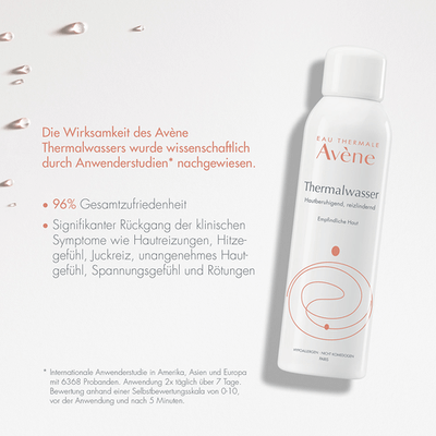 Es wurde eine Anwenderstudie (2014, Amerika, Asien, Europa) mit 6.368 Probanden mit empfindlicher und gereizter Haut nach einem oberflächlichen dermatologischen Eingriff über 7 Tage mit dem Avène Thermalwasser durchgeführt. Anwendung zweimal täglich allein oder in Kombination mit medikamentösen Behandlungen und/oder anderen kosmetischen Produkten.