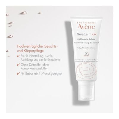 Der Avène XeraCalm A.D Balsam zeichnet sich durch seinen sterilen Pumpspender aus, der eine einfache Dosierung und hygienische Entnahme ermöglicht und für eine hohe Verträglichkeit sorgt. Die hochverträgliche Gesichts- und Körperpflege ist bereits für Babys ab 1 Monat geeignet. Der Balsam wird steril hergestellt sowie abgefüllt und ist ohne Duft- und Konservierungsstoffe. Besonders ist der Balsam bei sehr trockener Haut, atopischen Hautzuständen, zu Neurodermitis neigender Haut oder Altersxerose geeignet.