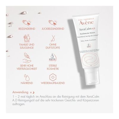 1- bis 2- mal täglich im Anschluss an die Reinigung mit dem XeraCalm A.D Reinigungsöl auf die sehr trockenen Gesichts- und Körperzonen auftragen.