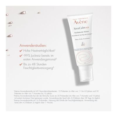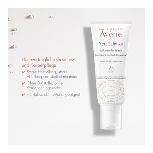Die Avène XeraCalm A.D Pflegeserie ist speziell für die extrem trockene und zu Neurodermitis neigende Haut konzipiert worden. Sie beruhigt die Haut, wirkt stark rückfettend und lindert den quälenden Juckreiz, unter dem vor allem Neurodermitis-Patienten sehr leiden. Von der Reinigung bis zur Pflege und Intensivpflege bietet Avène XeraCalm A.D genau die richtigen Formulierungen für die angegriffene und strapazierte, trockene Haut. Der Säureschutzmantel wird schnell wiederaufgebaut und die Haut mit Nährstoffen und Feuchtigkeit versorgt. Zusätzlich entspannt der sehr hohe Anteil an Avène Thermalwasser die Haut und beruhigt sie dank der reizlindernden und entzündungshemmenden Eigenschaften. Alle Produkte haben hochverträgliche Formulierungen, um das Risiko von allergischen Reaktionen zu minimieren. Durch die sterile Herstellung und die sterile Entnahme aufgrund des sterilen Verschlusses bei Creme, Balsam und Anti-Juckreiz Konzentrat wird der Tubeninhalt zusätzlich vor eindringenden Keimen geschützt und somit kann auf Konservierungsstoffe und Duftstoffe verzichtet werden. Eine maximale Hautverträglichkeit ist garantiert.