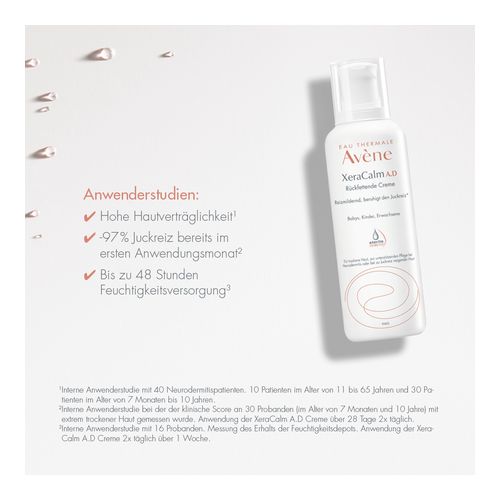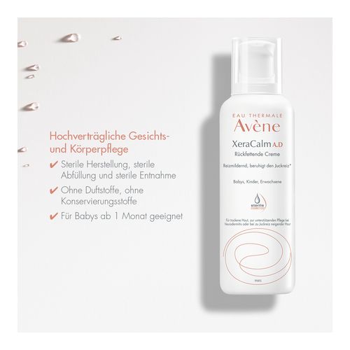 Die Avène XeraCalm A.D Creme zeichnet sich durch ihren sterilen Pumpspender aus, der eine einfache Dosierung und hygienische Entnahme ermöglicht und für eine hohe Verträglichkeit sorgt. Die hochverträgliche Gesichts- und Körperpflege ist bereits für Babys ab 1 Monat geeignet. Die Creme wird steril hergestellt sowie abgefüllt und ist ohne Duft- und Konservierungsstoffe. Besonders ist die Creme bei trockener Haut, atopischen Hautzuständen, zu Neurodermitis neigender Haut oder Altersxerose geeignet.