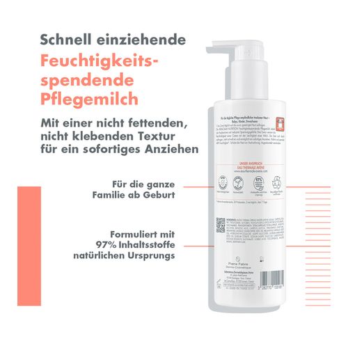 Feuchtigkeitsspendende und nährende Pflegemilch für empfindliche trockene Haut, geeignet für die ganze Familie ab Geburt.