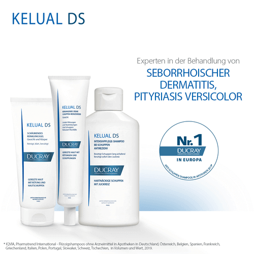 DUCRAY KELUAL DS Shampoo wurde speziell entwickelt, um unangenehmen Hautausschlägen und Ekzemen im Bereich der Kopfhaut entgegenzuwirken. Sind diese Ekzeme mit Schuppungen oder einem Hefepilzbefall verbunden, ist KELUAL DS Shampoo Ihre ideale Begleitpflege. Die Nr. 1 Empfehlung beim Dermatologen bei seborrhoischer Dermatitis hat eine schnelle und nachhaltige Wirkung. Der Duft des Shampoos ist dezent und Hypoallergen. Das Haar wird durch das Shampoo geschützt, gepflegt und ist optimal kämmbar. Die einmal wöchentliche Anwendung nach einer abgeschlossenen Schuppen-Behandlung mit DUCRAY KELUAL DS beugt wirksam einer erneuten Schuppenbildung vor.
