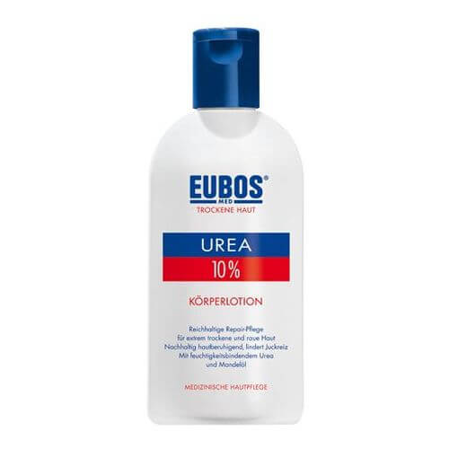 Trockene Haut weist oft einen Mangel an Lipiden und insbesondere an Urea – einem physiologischen, natürlichen Feuchthaltefaktor – auf. Als Folge kann es zum weiteren Austrocknen der oberen Hautschicht kommen. EUBOS 10 % UREA KÖRPERLOTION versorgt die Haut intensiv mit Feuchtigkeit bindendem Urea und erhöht so deutlich die Hydratationsfähigkeit der Haut. Urea wirkt auch keratolytisch, d. h., oberflächliche Hautschuppen werden gelöst, so dass eine hautglättende Wirkung erzielt wird. Allantoin sowie eine spezielle Lipidkombination mit Süßmandelöl helfen, die natürlichen Schutzfunktion der Haut zu stärken und vor übermäßigem Feuchtigkeitsverlust zu bewahren.