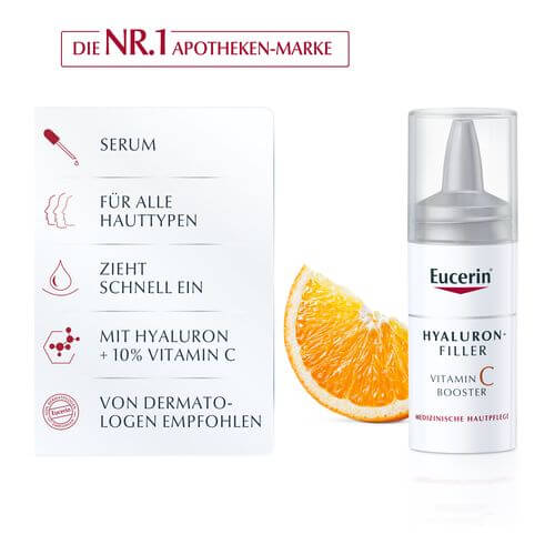 Eucerin Hyaluron-Filler Vitamin C Booster hilft effektiv, um freie Radikale und erste Anzeichen der Hautalterung zu bekämpfen. Freie Radikale bilden sich durch Umwelteinflüsse wie Sonneneinstrahlung, Umweltverschmutzung sowie Rauchen und beschleunigen vorzeitige Hautalterung.