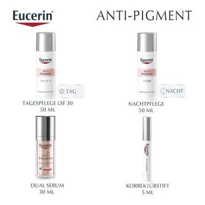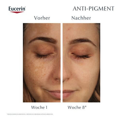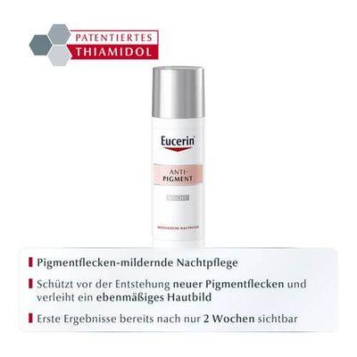 Die Eucerin Anti-Pigment Nachtpflege mit leichter, schnell einziehender Textur hilft wirksam bei Pigmentflecken und sogenannte Altersflecken. Der patentierte Wirkstoff Thiamidol® wirkt effektiv am Ursprung von Pigmentflecken und trägt bei regelmäßiger Anwendung sichtbar zu deren Milderung bei. Zusätzlich unterstützen Ceramide die Zellerneuerung über Nacht. Der Haut wird so ein strahlenderes Aussehen und ein ebenmäßigerer Hautton verliehen.
