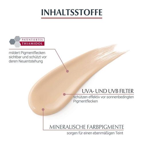 Die Eucerin Anti-Pigment Tagespflege mit pantentiertem Thiamidol® hilft Pigmentflecken bei regelmäßiger Anwendung zu mildern und schützt mit LSF 30 vor der Entstehung neuer sonnenbedingter Pigmentflecken. Zusätzlich werden diese durch die mineralischen Farbpigmente der getönten Tagescreme sofort abgedeckt. Für ein natürliches, ebenmäßiges Hautbild.