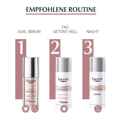 "- Morgens das Gesicht reinigen, Dual Serum anwenden und anschließend die Eucerin Anti-Pigment Creme auftragen, dabei direkten Augenkontakt vermeiden.