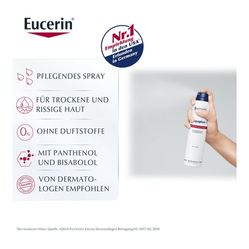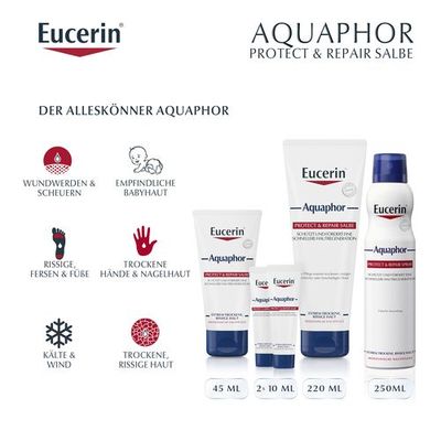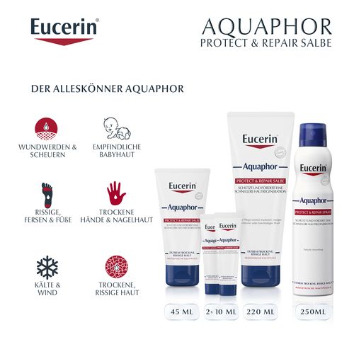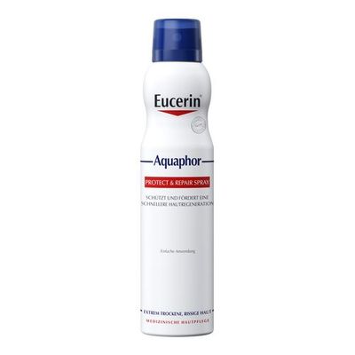 Mit dem Eucerin Aquaphor Protect & Repair Spray kann extrem trockene, rissige und irritierte Haut gepflegt werden und eine schnellere Hautregeneration wird unterstützt. Die Creme im innovativen Sprayformat hilft auch schwer erreichbare, größere Körperregionen, wie z.B. trockene Hautstellen am Rücken oder den Beinen zu versorgen.