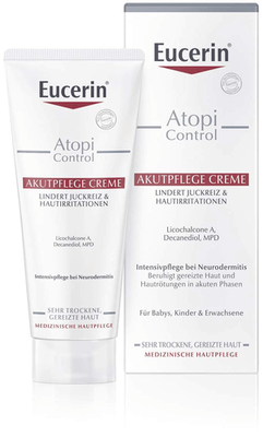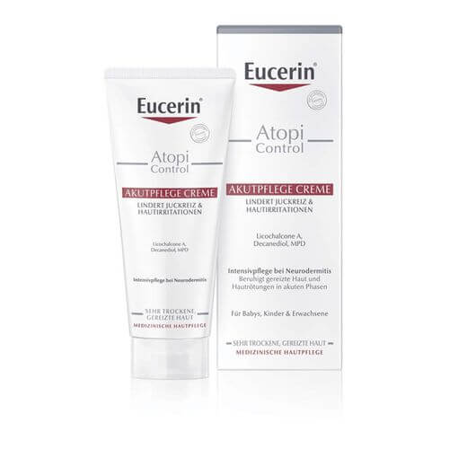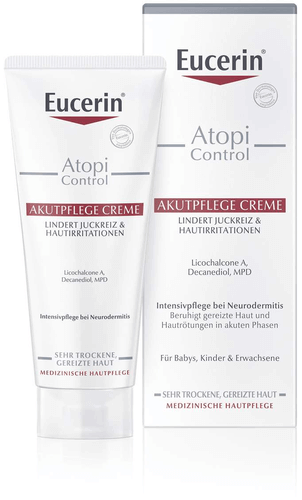 Die Eucerin AtopiControl Akutpflege Creme wurde speziell für die Behandlung von Schubphasen leichter Neurodermitis entwickelt. Hierbei lindert die Hautcreme den Juckreiz wirksam und beruhigt die Haut. Die Creme kann zur Hautpflege so oft wie nötig auf die betroffenen Hautstellen aufgetragen werden.