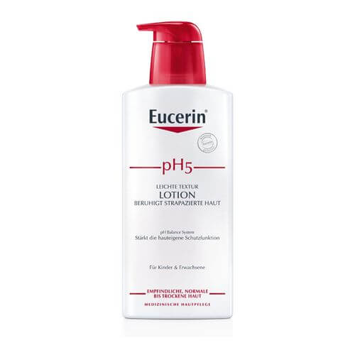 Beruhigt strapazierte Haut und stärkt die hauteigene Schutzfunktion. Spendet 24h intensive Feuchtigkeit und macht die Haut widerstandsfähiger und weniger empfindlich gegen äußere Einflüsse. Für Kinder und Erwachsene. Eucerin pH5 Leichte Textur Lotion ist eine sanfte, aber wirksame Körperpflege, die speziell entwickelt wurde, um empfindliche, normale bis trockene Körperhaut widerstandsfähiger und weniger empfindlich zu machen. Das einzigartige Eucerin pH Balance System mit dem pH5 Citratpuffer stellt den optimalen pH-Wert der Haut wieder her. Gleichzeitig hilft 5% Dexpanthenol, die Regeneration der Haut zu stimulieren und deren Widerstandskraft zu bewahren. Die Eucerin pH5 Lotion Leichte Textur hat 0% Emulgatoren, Parabene und Paraffine. Die neue Formel mit dezentem Duft und leichter Textur zieht schnell sofort ein ohne zu fetten für ein samtig-weiches Hautgefühl. Täglich anwenden für langanhaltenden Schutz, macht die Haut weicher und verbessert ihren Zustand im Laufe der Zeit. Für Kinder (ab drei Jahren) und Erwachsene.