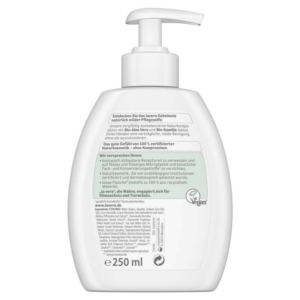 Entdecken Sie das lavera Geheimnis natürlich milder Pflegeseife: Unsere sorgfältig ausbalancierte Naturkomposition mit Bio-Aloe Vera und Bio-Kamille bietet Ihren Händen eine verträgliche, milde Reinigung, ohne sie auszutrocknen. Die pH-hautneutrale Formel mit zartem Pflegeschaum verleiht den Händen beim Waschen ein gepflegtes Hautgefühl. Auch für empfindliche und trockene Haut geeignet. Das gute Gefühl von 100% zertifizierter Naturkosmetik - ohne Kompromisse.