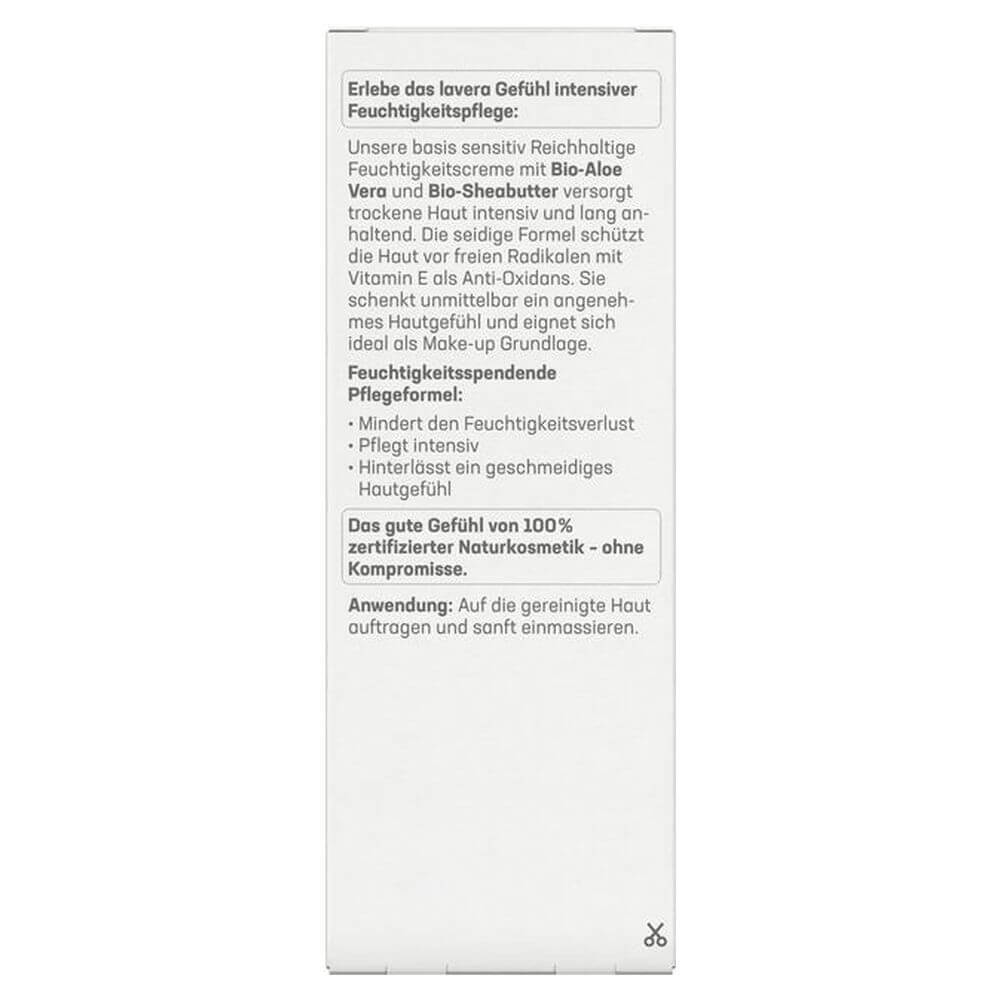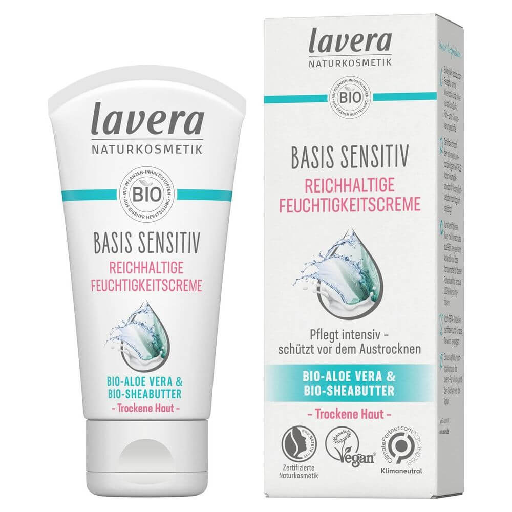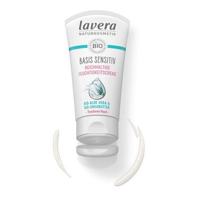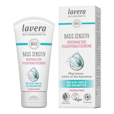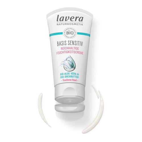 Die Lavera basis sensitiv Reichhaltige Feuchtigkeitscreme mit Bio-Aloe Vera und Bio-Sheabutter versorgt trockene Haut intensiv und lang anhaltend. Die seidige Formel schützt deine Haut vor freien Radikalen mit Vitamin E als Anti-Oxidans. Sie schenkt dir unmittelbar ein angenehmes Hautgefühl und eignet sich ideal als Make-up-Grundlage.