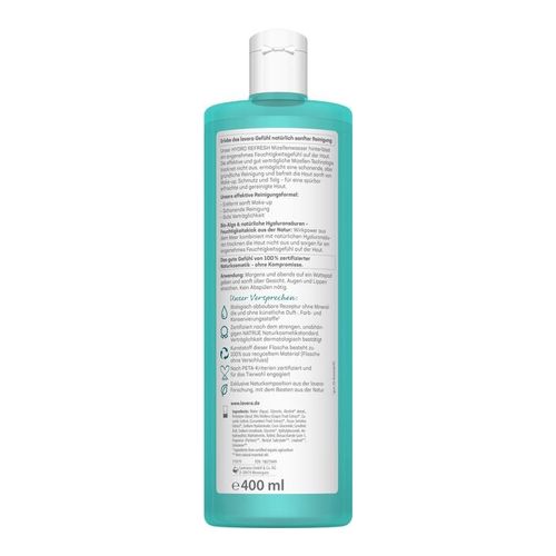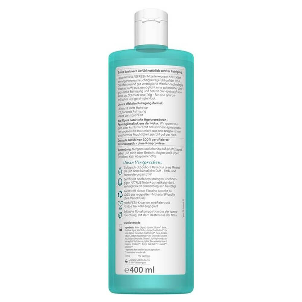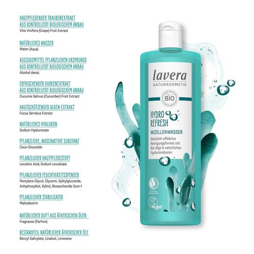Das lavera Hydro Refresh Mizellenwasser hinterlässt ein angenehmes Feuchtigkeitsgefühl auf der Haut. Die effektive und gut verträgliche Mizellen-Technologie trocknet nicht aus, ermöglicht eine schonende, aber gründliche Reinigung und befreit die Haut sanft von Make-up, Schmutz und Talg - für eine spürbar erfrischte und gereinigte Haut.
