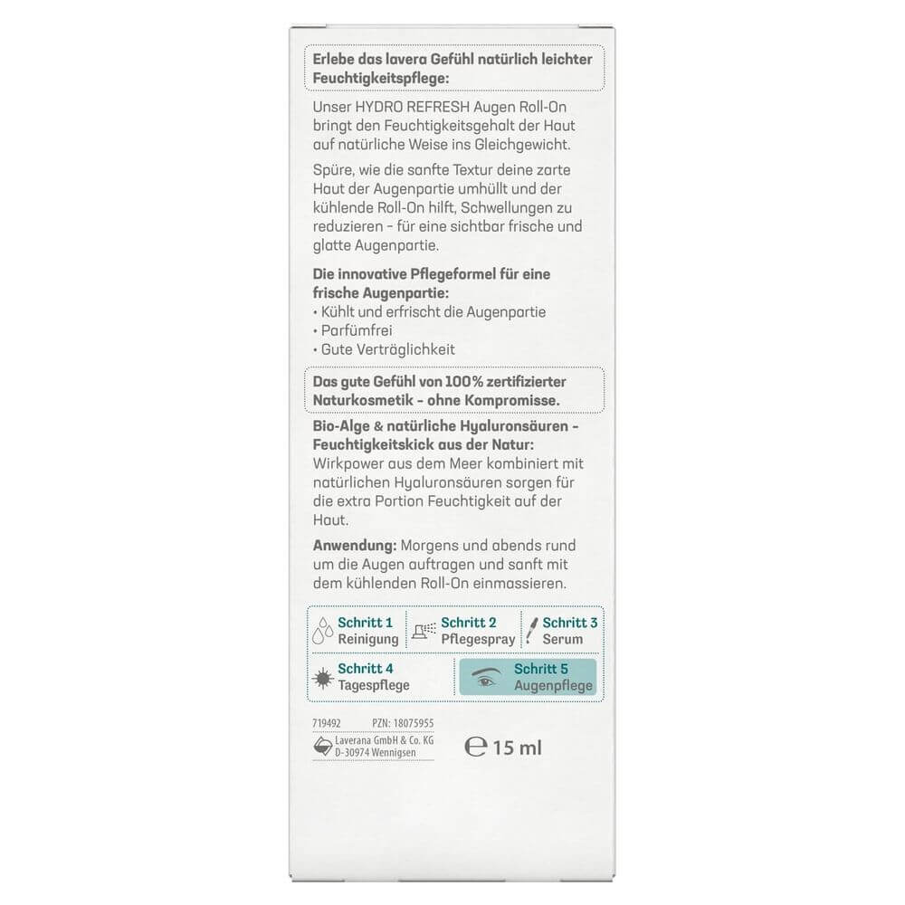 Morgens und abends rund um die Augen auftragen und sanft mit dem kühlenden Roll-On einmassieren. Für ein optimales Ergebnis, verwende auch die anderen Produkte aus unserer lavera HYDRO Refresh Pflegelinie.