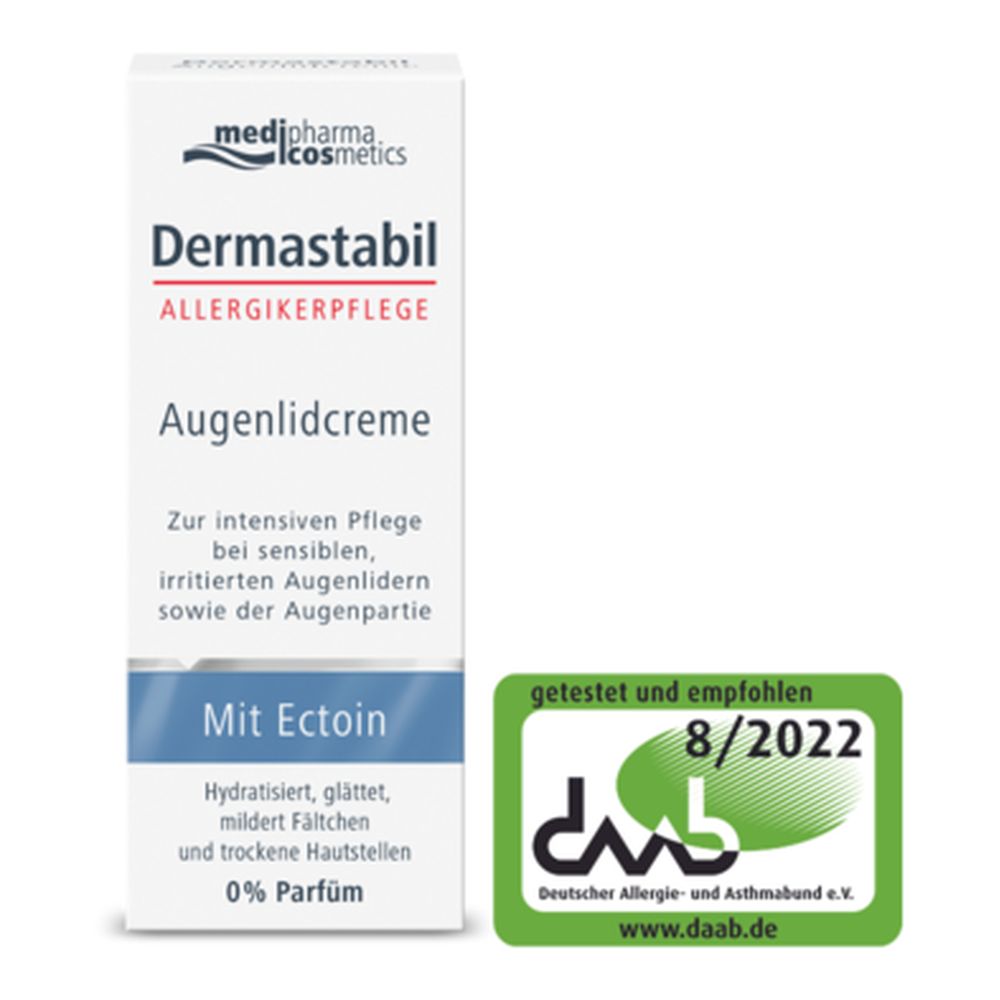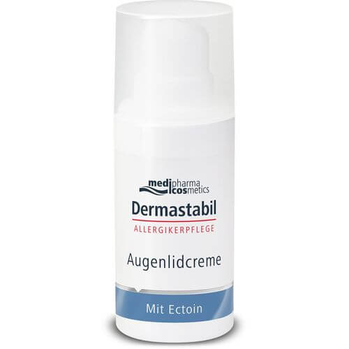 Medipharma Cosmetics Dermastabil Augenlidcreme mit Ectoin ist auf die speziellen Pflegebedürfnisse von sensibler, irritierter und zu Allergien neigender Haut abgestimmt. Sie stärkt und stabilisiert die natürliche Hautschutzbarriere der empfindlichen Augenpartie, mildert Fältchen und trockene Hautstellen. Die Haut der Augenpartie ist bei Allergikern häufig besonders gereizt. Durch juckende Augen und ständiges Reiben werden die Probleme verschlimmert. Dermastabil Augenlidcreme von medipharma cosmetics stärkt und stabilisiert die angegriffene Hautschutzbarriere der empfindlichen Augenpartie und spendet Feuchtigkeit. Sie glättet, mildert Fältchen sowie trockene Hautstellen.