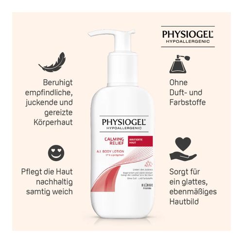Die PHYSIOGEL® Calming Relief A.I. Body Lotion ist eine leichte Lotion, welche für irritierte oder juckende Haut entwickelt wurde. Durch einen hautberuhigenden Wirkkomplex aus hautverwandten Lipiden und Palmitoylethanolamin (PEA) lindert die PHYSIOGEL® Calming Relief A.I. Body Lotion Juckreiz und Rötungen, zudem wird die Haut natürlich und sanft gepflegt.