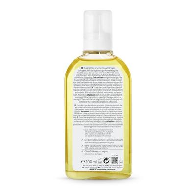 Die Anti-Schuppen-Kopfhaut-Lotion mit Huflattich befreit mild und nachhaltig von trockenen Schuppen und juckender Kopfhaut. Zudem mildert sie den Juckreiz und reduziert Rötungen. Angereichert ist die Spezialpflege mit dermatologischem Elementarschwefel. Dieser kann dank seiner antibakteriellen Eigenschaften dabei helfen, die Haut zu beruhigen und zu klären. Seine kleinen Partikel sind optisch erkennbar und senken sich zum Flaschenboden ab – vor der Anwendung muss die Lotion deshalb kräftig geschüttelt werden. Anschliessend mit dem praktischen Dosierapplikator scheitelweise gezielt auf die betroffenen Stellen auftragen. Die Lotion wird idealerweise einige Stunden oder über Nacht auf der Kopfhaut belassen und danach wieder ausgespült. Sie fühlt sich sofort angenehm erfrischt und beruhigt an.
