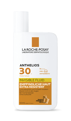 Das Sonnenfluid ANTHELIOS INVISIBLE FLUID LSF 30 von La Roche-Posay ist extra wasserfest, schweißresistent und sandabweisend. Seine ultra-leichte Textur lässt sich einfach auf der Haut verteilen und kann selbst in der empfindlichen Augenpartie angewendet werden. Dank der Intelimer-Technologie brennt das dermatologische Sonnenfluid nicht in den Augen und bietet auch für Sportler zuverlässigen Schutz vor der Sonne. Das INVISIBLE FLUID LSF 30 ist für empfindliche oder zu Sonnenallergie neigende Haut geeignet und auch für Kontaktlinsenträger als Sonnenpflege geeignet. Die Formulierung ohne Oxybenzon und Octinoxat ist respektvoll zu Korallen.