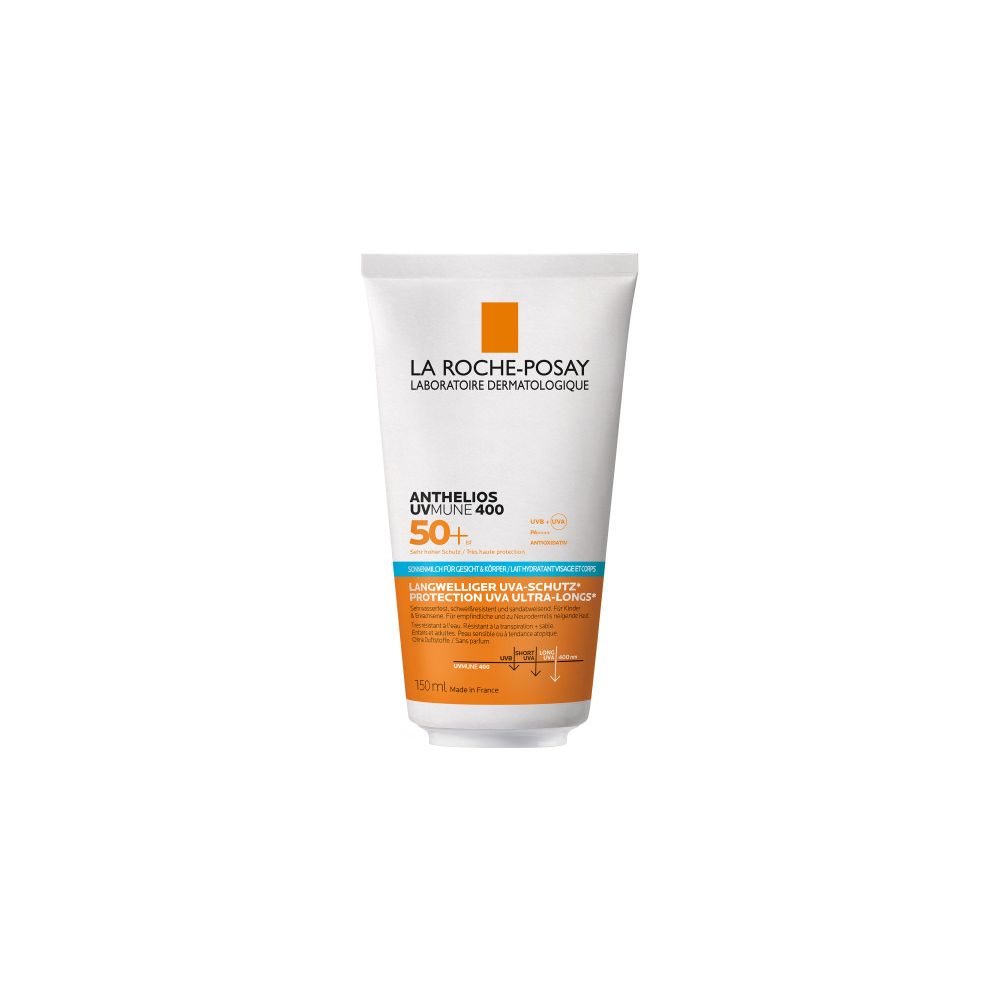 Die La Roche Posay ANTHELIOS UV Mune 400 Hydratisierende Gesicht + Körper Milch LSF 50+ sorgt dank des Filters Mexoryl 400 für einen sehr hohen Schutz vor den schädigenden Auswirkungen der UVA- und UVB-Strahlung sowie vor langwelligem UVA. Weitere Bestandteile des Sonnenschutzes für Erwachsene und Kinder ist antioxidativ wirkendes Vitamin E sowie nährendes Glycerin, welches die Haut mit Feuchtigkeit versorgt. Sie eignet sich für empfindliche und zu Sonnenallergie neigende Haut an Gesicht und Körper. Die leichte Textur der Creme zieht schnell ein, ohne weiße Rückstände oder ein klebendes Gefühl zu hinterlassen. Darüber hinaus ist der Sonnenschutz resistent gegenüber Wasser, Schweiß und Sand.