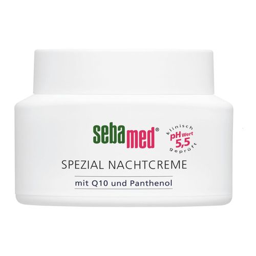 sebamed Spezial Nachtcreme mit Q10 ist optimal auf den Bedarf der anspruchsvollen Haut abgestimmt. Das Pflegekonzept nutzt die erhöhte Aufnahmefähigkeit der Haut am Abend. So wird die Haut gezielt mit den Wirkstoffen versorgt, die sie für die Regeneration über Nacht braucht. Die Pflegeformel mit Q10 wirkt glättend und trägt zum Schutz vor vorzeitiger Hautalterung bei. Panthenol unterstützt die Regenerationsprozesse der Hautzellen. Vitamin E neutralisiert freie Radikale, die durch Umweltschadstoffe und UV-Strahlung entstehen und trägt so zum Schutz vor vorzeitiger Hautalterung bei. Der Aktivkomplex mit Süßmandelöl und Sheabutter bereichert das Lipidreservoir der Haut, glättet die Haut und schützt vor Austrocknung. Der pH-Wert 5,5 stärkt den Hautschutzmantel und fördert so die natürliche Widerstandskraft gegen schädliche Umwelteinflüsse.