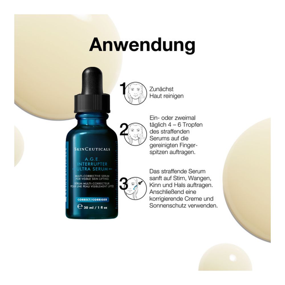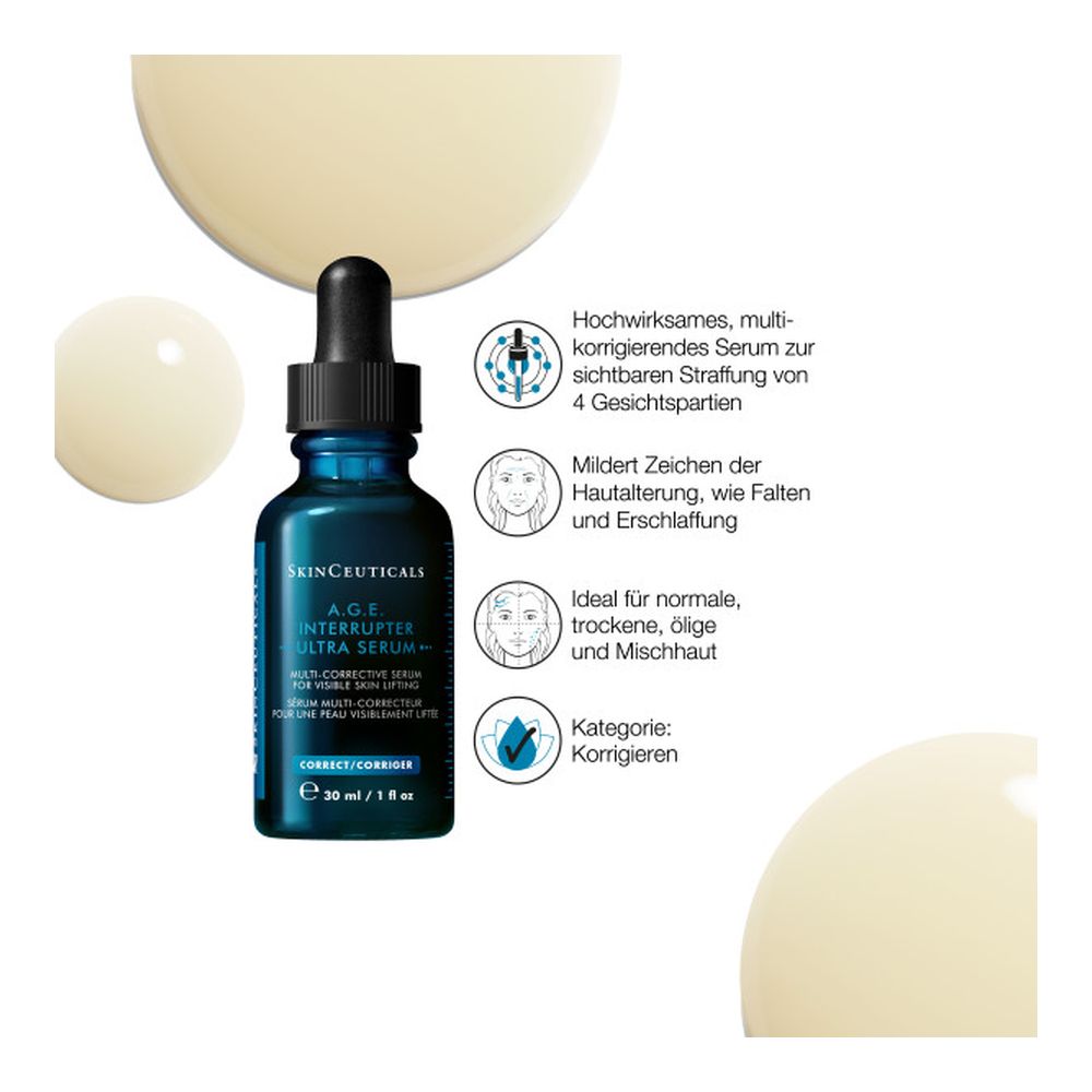 SkinCeuticals A.G.E. Interrupter Ultra Serum ist ein straffendes Anti-Aging-Serum mit Lifting-Effekt. Es enthält eine 34,6%-Flavo-Proxylane-Technologie sowie die synergetisch wirkenden Inhaltsstoffe Rhamnose und Enzian-Extrakt. Geeignet als Ergänzung zu Lifting- und Ultraschall-Behandlungen mildert das Gesichtsserum sichtbar Anzeichen der Hautalterung, die durch Glykation und den natürlichen Kollagenabbau verursacht werden. So wirkt das straffende A.G.E. Interrupter Ultra Serum effektiv Falten, Hautschlaffheit und einem fahlen Hautbild entgegen. Das Anti-Aging-Serum ist für normale, trockene, fettige und Mischhaut geeignet, spendet der Hautschutzbarriere Feuchtigkeit und stärkt sie nachhaltig.