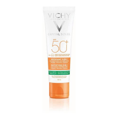 Die CAPITAL SOLEIL 3-IN-1 MATTIERENDE SONNENPFLEGE LSF 50+ von Vichy ist eine Sonnencreme mit Anti-Glanz-Effekt für das Gesicht. Sie überzeugt mit einem 3-in-1 Effekt: absorbierend, mattierend und schützend. Die Formel mit Tonerde absorbiert überschüssige Fette und wirkt mattierend. Zusätzlich schützen das Vulkanische Wasser aus Vichy und ein probiotischer Extrakt gegen Anzeichen von fettiger Haut und stärken die Hautbarriere. Dank des Anti-Glanz-Effektes und hohen Sonnenschutzes dient die Sonnenpflege auch als eine perfekte Ergänzung zur Tagespflege.