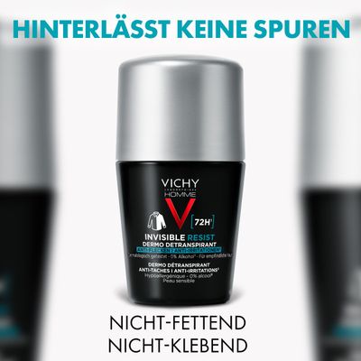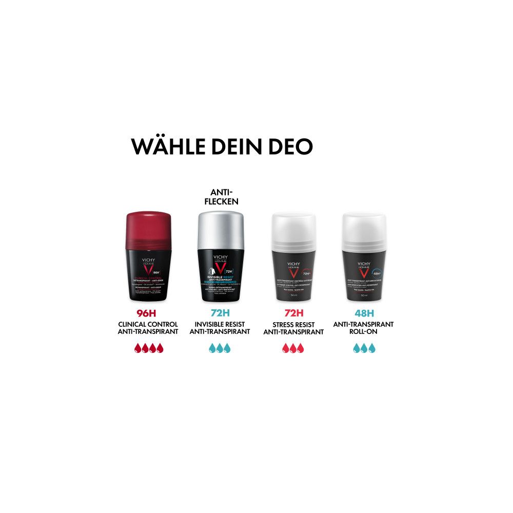 Anders als herkömmliche Deos sorgt der Vichy Homme Deo Roll-on 72h AT Invisible bis zu 72 Stunden lang für eine gehemmte Schweißbildung und hinterlässt dank seiner Anti-Flecken-Formel keine gelblichen und weißen Rückstände auf Textilien. Durch den hypoallergenen Wirkstoffkomplex und die alkoholfreie Formulierung, ist das Deodorant besonders hautfreundlich und somit für empfindliche Männerhaut geeignet.