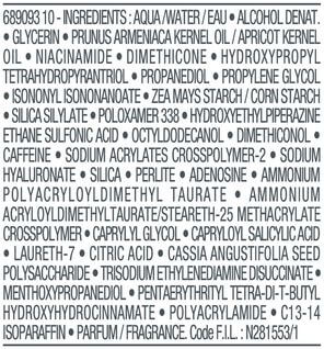 AQUA / WATER / EAU • ALCOHOL DENAT. • GLYCERIN • PRUNUS ARMENIACA KERNEL OIL / APRICOT KERNEL OIL • NIACINAMIDE • DIMETHICONE • HYDROXYPROPYL TETRAHYDROPYRANTRIOL • PROPANEDIOL • PROPYLENE GLYCOL • ISONONYL ISONONANOATE • ZEA MAYS STARCH / CORN STARCH • SILICA SILYLATE • POLOXAMER 338 • HYDROXYETHYLPIPERAZINE ETHANE SULFONIC ACID • OCTYLDODECANOL • DIMETHICONOL • CAFFEINE • SODIUM ACRYLATES CROSSPOLYMER-2 • SODIUM HYALURONATE • SILICA • PERLITE • ADENOSINE • AMMONIUM POLYACRYLOYLDIMETHYL TAURATE • AMMONIUM ACRYLOYLDIMETHYLTAURATE/STEARETH-25 METHACRYLATE CROSSPOLYMER • CAPRYLYL GLYCOL • CAPRYLOYL SALICYLIC ACID • LAURETH-7 • CITRIC ACID • CASSIA ANGUSTIFOLIA SEED POLYSACCHARIDE • TRISODIUM ETHYLENEDIAMINE DISUCCINATE • MENTHOXYPROPANEDIOL • PENTAERYTHRITYL TETRA-DI-T-BUTYL HYDROXYHYDROCINNAMATE • POLYACRYLAMIDE • C13-14 ISOPARAFFIN • PARFUM / FRAGRANCE