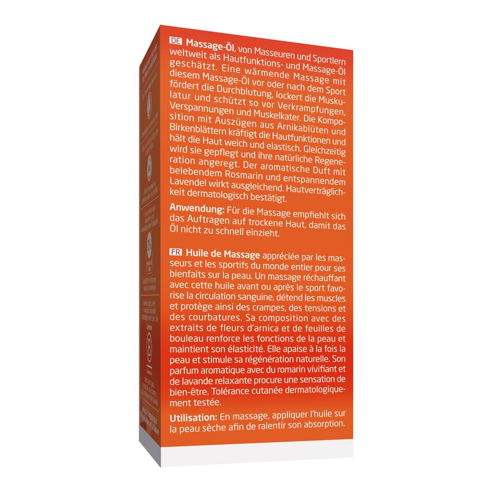 Zur Massage auf die Handfläche geben und damit, je nach Körperteil, sanfte bis kräftige Streich-, Klopf-, Knet- oder Vibrationsbewegungen ausführen. Zur täglichen Hautpflege nach Dusche oder Bad sparsam in die noch leicht feuchte Haut einreiben, so lässt sich das Öl gut verteilen und zieht rasch ein, ohne einen Fettfilm zu hinterlassen. Verschluss sauber halten.