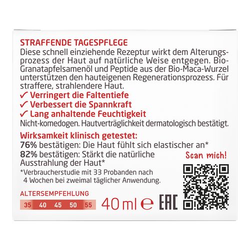 Bio-Granatapfelsamenöl und Peptide aus Bio-Maca-Wurzel unterstützen den hauteigenen Regenerationsprozess. Spendet lang anhaltend Feuchtigkeit. Verbessert die Spannkraft.