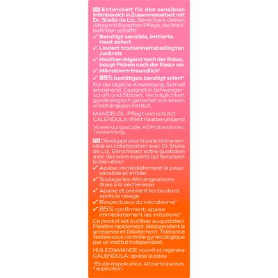 Die Formulierung ist mikrobiofreundlich, gynäkologisch getestet und auch für die Anwendung während Schwangerschaft und Stillzeit geeignet. Der zarte, leicht süßlich-tropische Duft sorgt für ein angenehmes Pflegeerlebnis und ein sofortiges Wohlbefinden im Intimbereich.